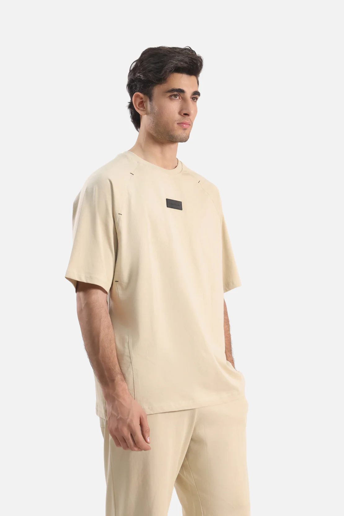 This oversized crew-neck T-shirt features raglan sleeves, contrast stitch detailing at the sleeve panels, and a panel at the back neck for a subtle design touch. Crafted in soft interlock fabric, it can be worn on its own or paired with coordinating pieces, offering effortless, contemporary style with a relaxed, city-ready fit.